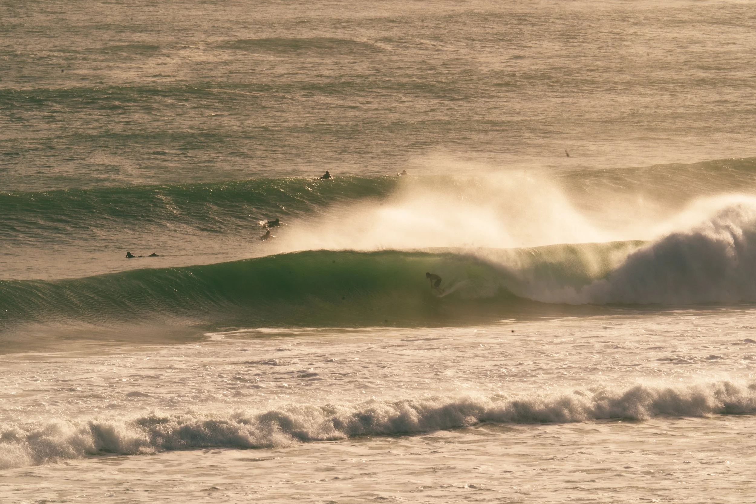 Inside-the-wave POV, marine life, and surf line-up shots.